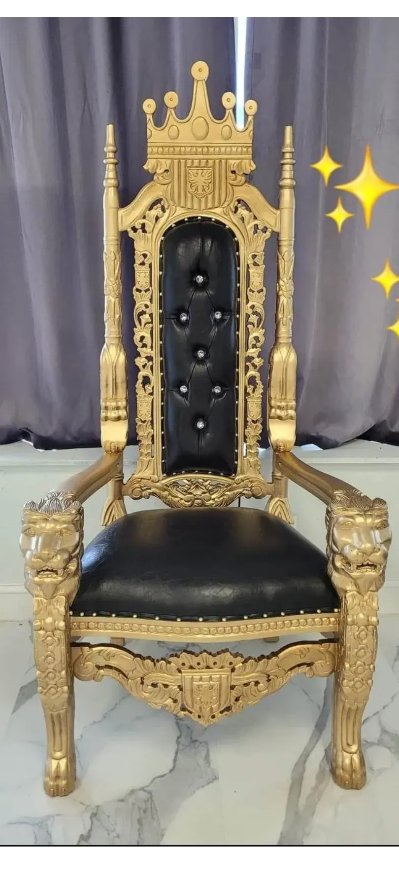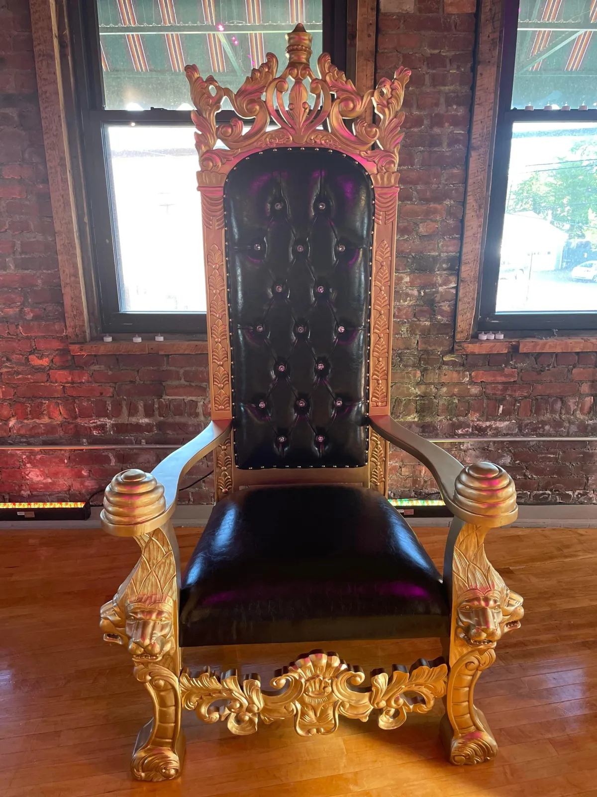 Introducing the Goliath Throne Chair - gold wood, black leather. Showstopper! Lion head carvings for added elegance. Perfect for weddings, events, parties. Regal and comfortable. Rent now to impress!