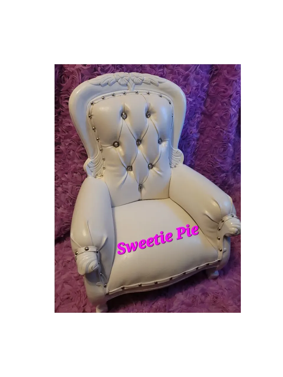 Introducing the Sweetie Pie Throne Chair - charming white wood, white leather. Perfect for kid's events. Adorable size, comfortable seating. Complements any decor. Fresh and modern look. Rent now to make your child feel like royalty!