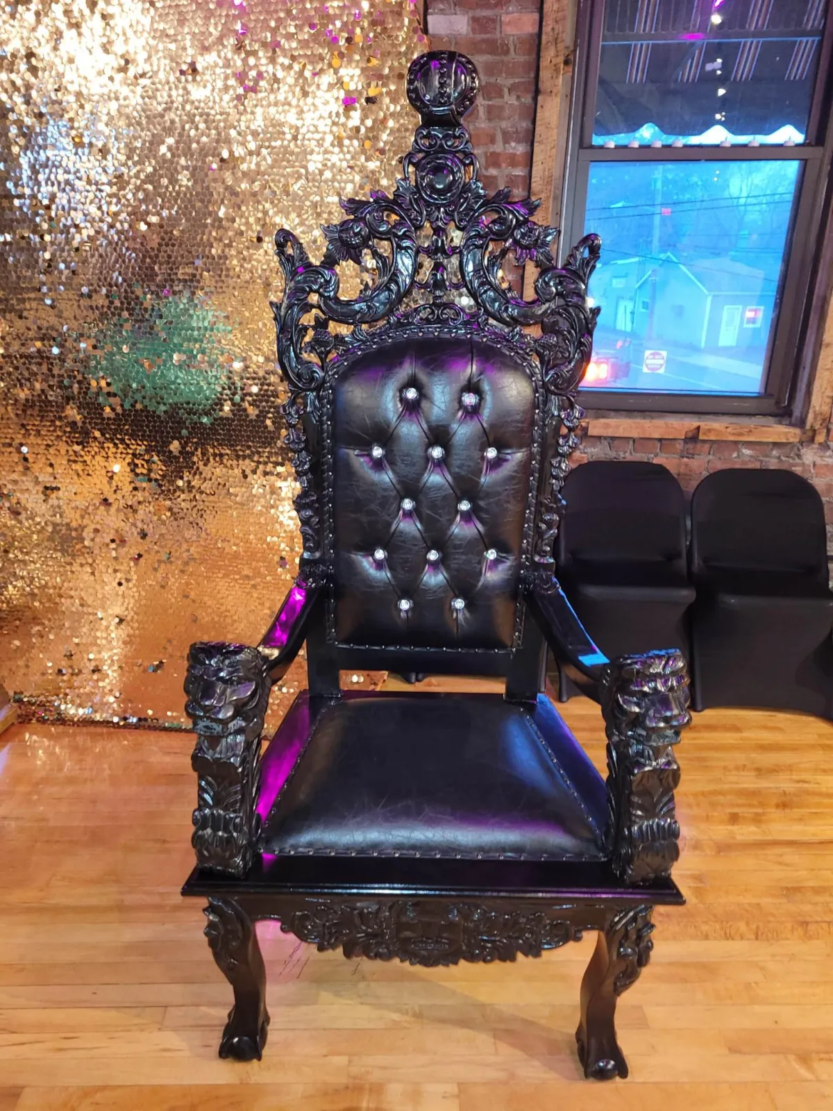 Introducing the Adrian Throne Chair - sleek black wood, black leather. Modern and sophisticated. Lion head carvings for added elegance. Perfect for weddings, events, parties. Regal and comfortable.
